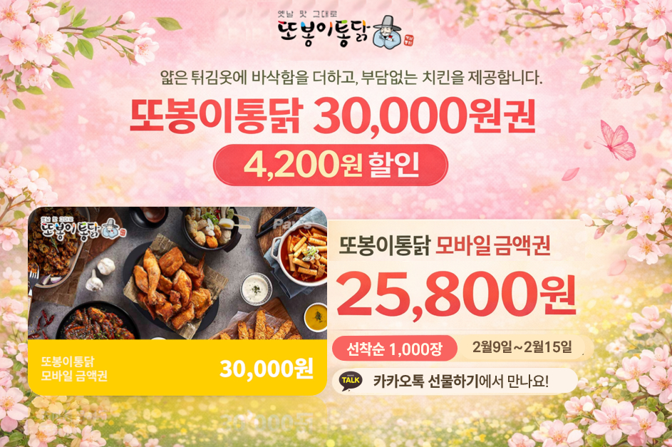 치킨 프랜차이즈 또봉이통닭이 카카오톡 선물하기를 통해 3만원권 모바일교환권을 4,200원 할인한 25,800원에 선착순 판매한다고 밝혔다. 이번 프로모션은 2월 9일부터 2월 15일까지 일주일간, 총 1,000장 한정으로 진행된다.