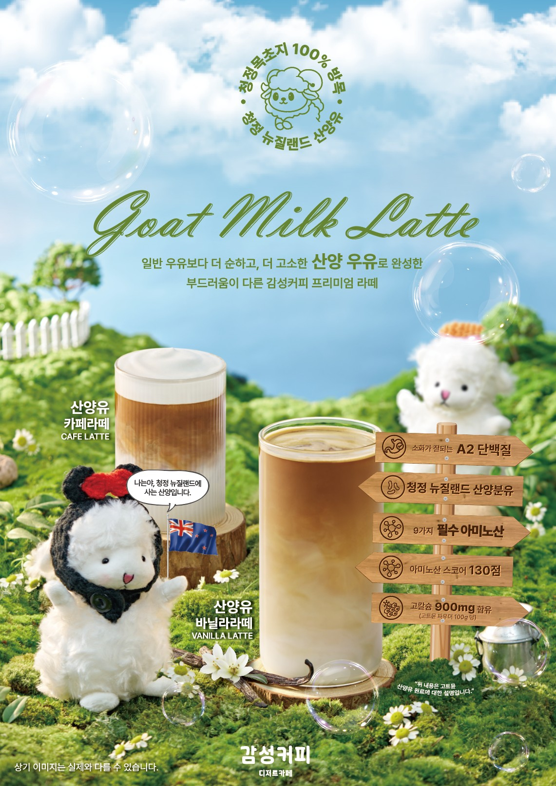 감성커피가 청정 뉴질랜드에서 자란 산양의 산양유를 활용한 프리미엄 라떼 신메뉴 '산양유카페라떼'와 '산양유바닐라라떼' 2종을 새롭게 선보인다.