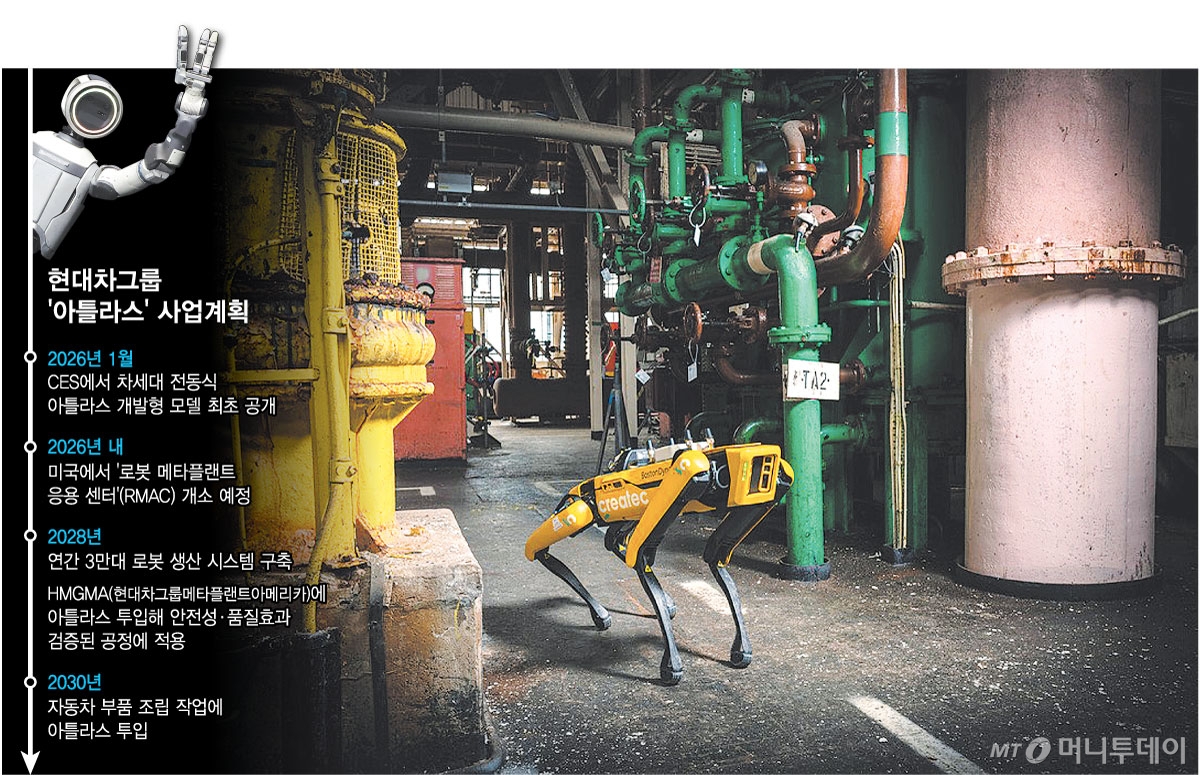 현대차그룹은 지난달 AI(인공지능)·로보틱스·자율주행 분야 세계적 전문가인 밀란 코박을 그룹 자문역 겸 보스턴다이나믹스 사외이사로 임명하는 등 내부조직 정비에도 속도를 내고 있다. 이와 별도로 아틀라스의 개발·고도화 단계를 넘어 양산과 공장 내 실전투입을 준비하고 있다. 2028년까지 연간 3만대 규모의 로봇생산 시스템을 구축한다는 목표다. 같은 시기 현대차그룹메타플랜트아메리카(HMGMA)에서도 부품분류를 위한 서열작업 등 안전성·품질효과가 검증된 공정에 아틀라스를 투입한다. 2030년부터는 부품조립까지 작업범위를 넓히는 등 단계적으로 생산현장 전반에 확산한다는 계획이다.