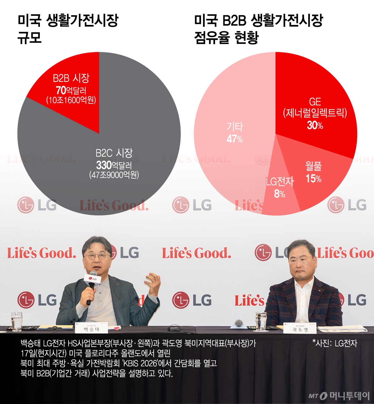 LG전자가 세계 최대 가전시장인 미국에서 개인 고객을 상대로 한 B2C(기업과 개인의 거래) 시장 1위에 이어 B2B 빌트인 시장에서도 3위권 진입을 눈앞에 뒀다. LG전자 생활가전사업부문을 이끄는 백승태 HS사업본부장(부사장)은 17일(현지시간) 미국 플로리다주 올랜도에서 열린 북미 최대 주방·욕실 가전박람회 'KBIS 2026'에서 기자간담회를 열고 이같이 밝혔다. 도널드 트럼프 행정부 들어 관세 정책과 인건비 상승 등으로 주택경기가 위축된 상황에서도 최근 2년 동안 각각 60%, 40% 수준의 성장률을 기록한 데 따른 자신감이다.