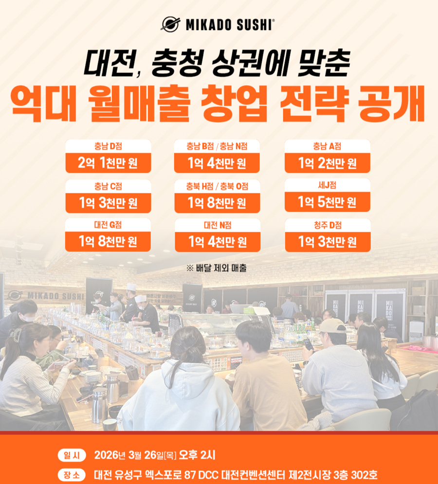 국내 프리미엄 회전초밥 브랜드 미카도스시가 오는 3월 26일 대전컨벤션센터에서 '2026 미카도스시 3월 대전·충청 창업설명회'를 개최한다. 이번 설명회는 대전·충청지역 예비 창업자를 대상으로 검증된 수익 구조와 안정적인 운영 시스템을 기반으로 한 '억대 매출 안정형 창업 전략'을 집중 소개하는 자리로 마련된다.