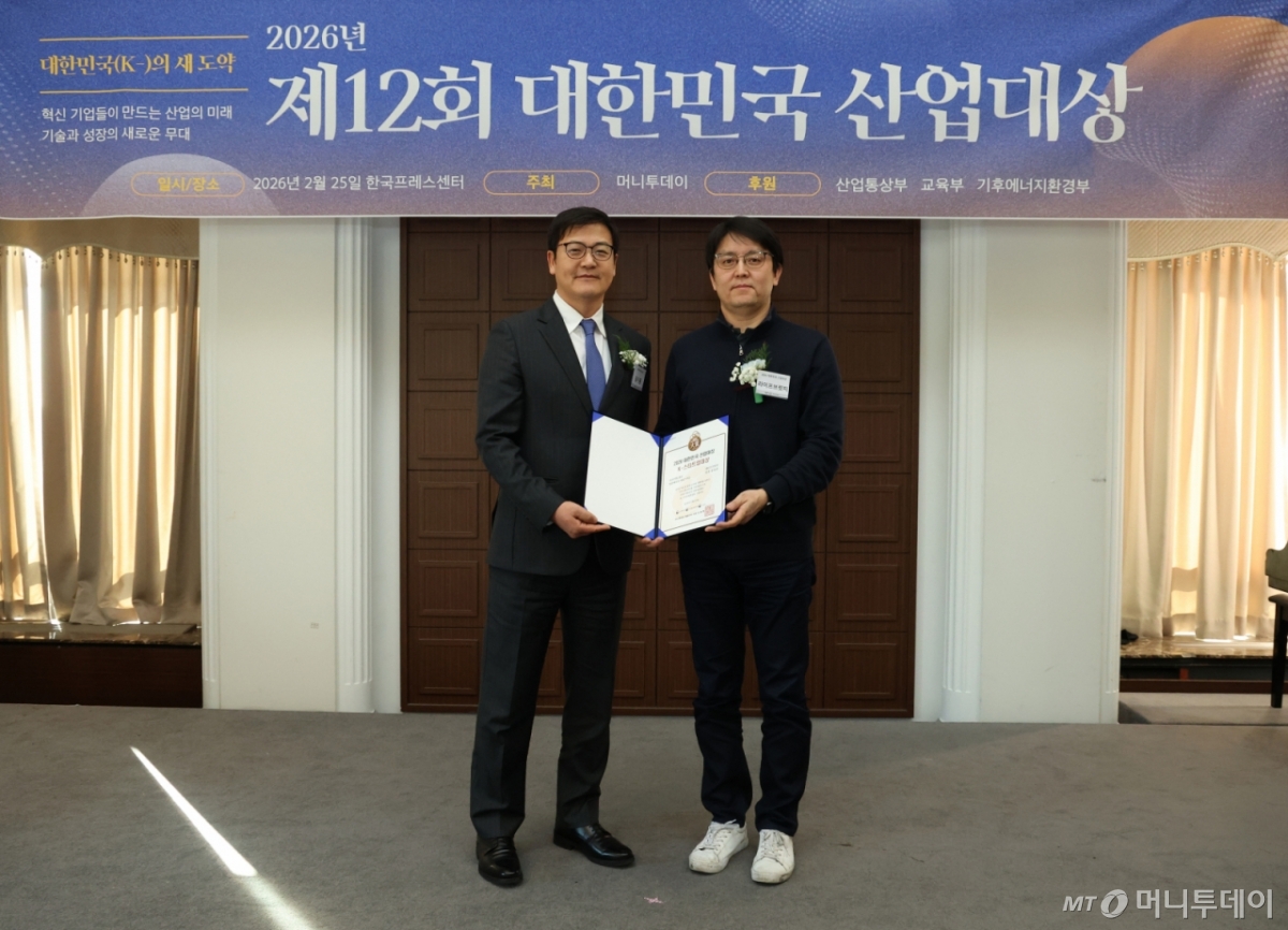 송성준 라이프브릿지 대표(사진 오른쪽)가 25일 오후 서울 중구 한국프레스센터에서 열린 머니투데이 주최의 '2026 제12회 대한민국 산업대상' 시상식에서 AI 디지털 휴먼 영상 메시지 서비스 부문으로 'K-스타트업대상'을 수상한 뒤 송기용 머니투데이 전무와 기념 촬영 중이다.