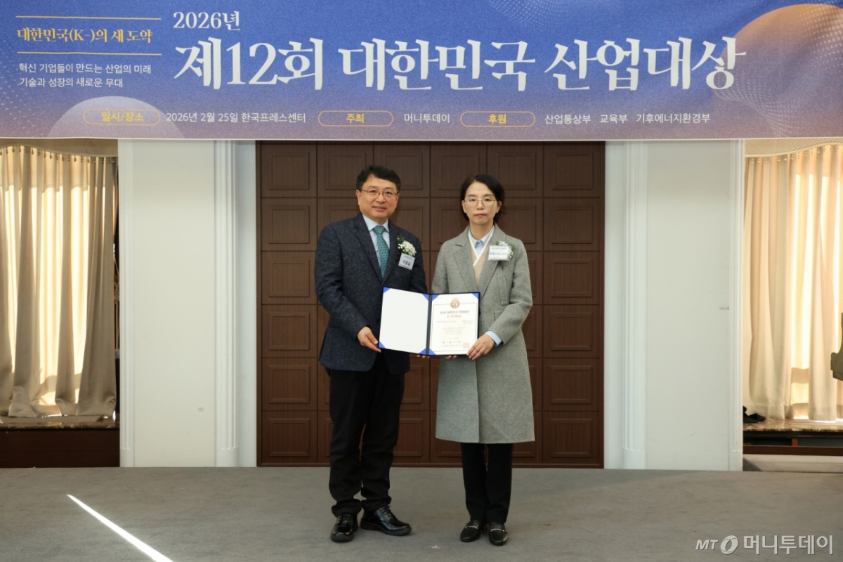 박봉주 포레스트소프트 대표(사진 오른쪽)가 25일 오후 서울 중구 한국프레스센터에서 열린 머니투데이 주최의 '2026 제12회 대한민국 산업대상' 시상식에서 '빅데이터/생성형 AI 교육' 부문 'K-ICT대상'을 수상하고 이종섭 동국대학교 교수와 기념사진을 촬영 중이다.