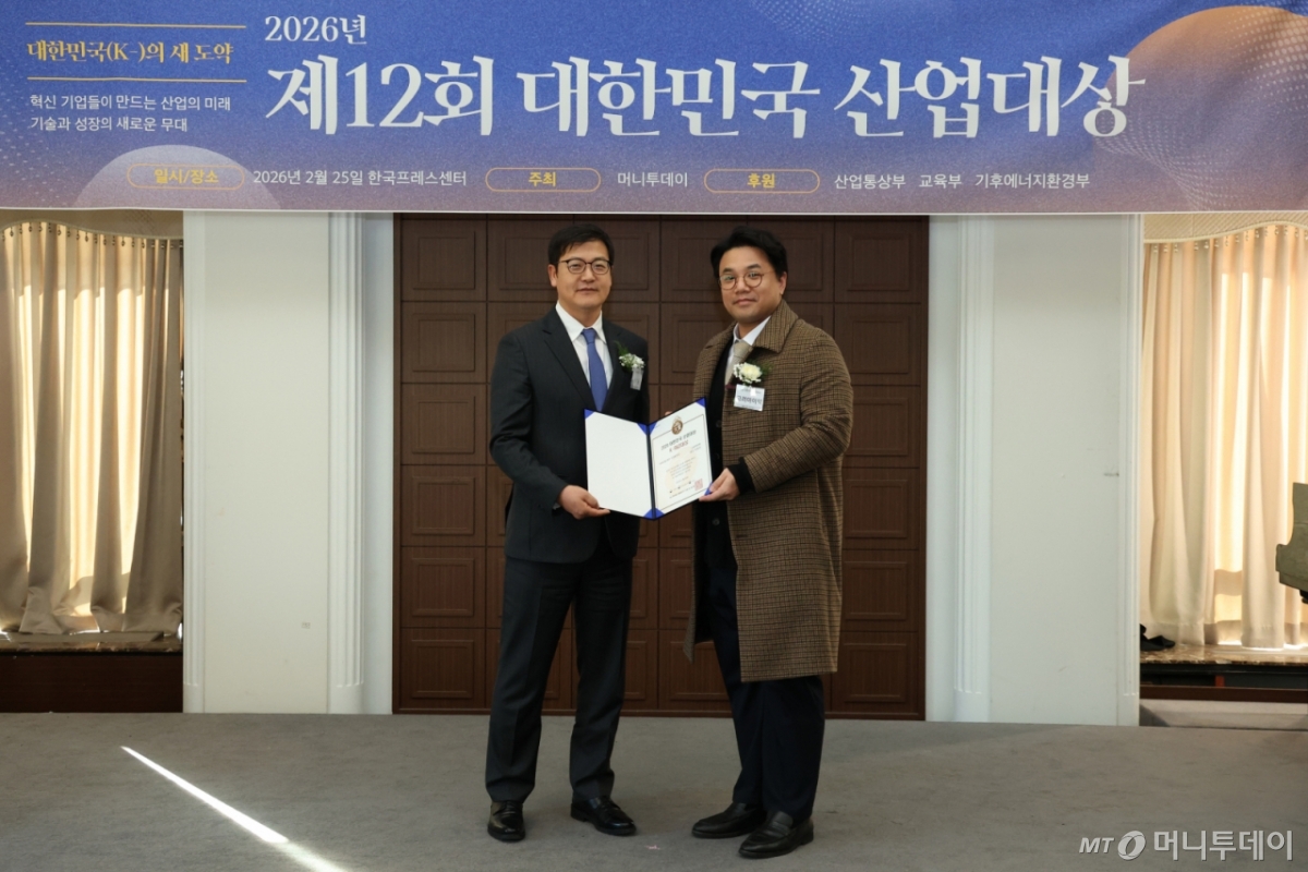 이준우 고려아이텍 이사(사진 오른쪽)가 25일 오후 서울 중구 한국프레스센터에서 열린 머니투데이 주최의 '2026 제12회 대한민국 산업대상' 시상식에서 안내 삽입 렌즈 국산화 부문으로 'K-R&D대상'을 수상한 뒤 송기용 머니투데이 전무와 기념 촬영 중이다.