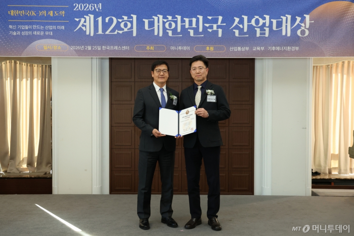 민병진 아롬정보기술 상무(사진 오른쪽)가 25일 오후 서울 중구 한국프레스센터에서 열린 머니투데이 주최의 '2026 제12회 대한민국 산업대상' 시상식에서 산업재해 예방 안전관리 플랫폼 부문으로 'K-ICT대상'을 받고 송기용 머니투데이 전무와 기념사진을 찍고 있다.