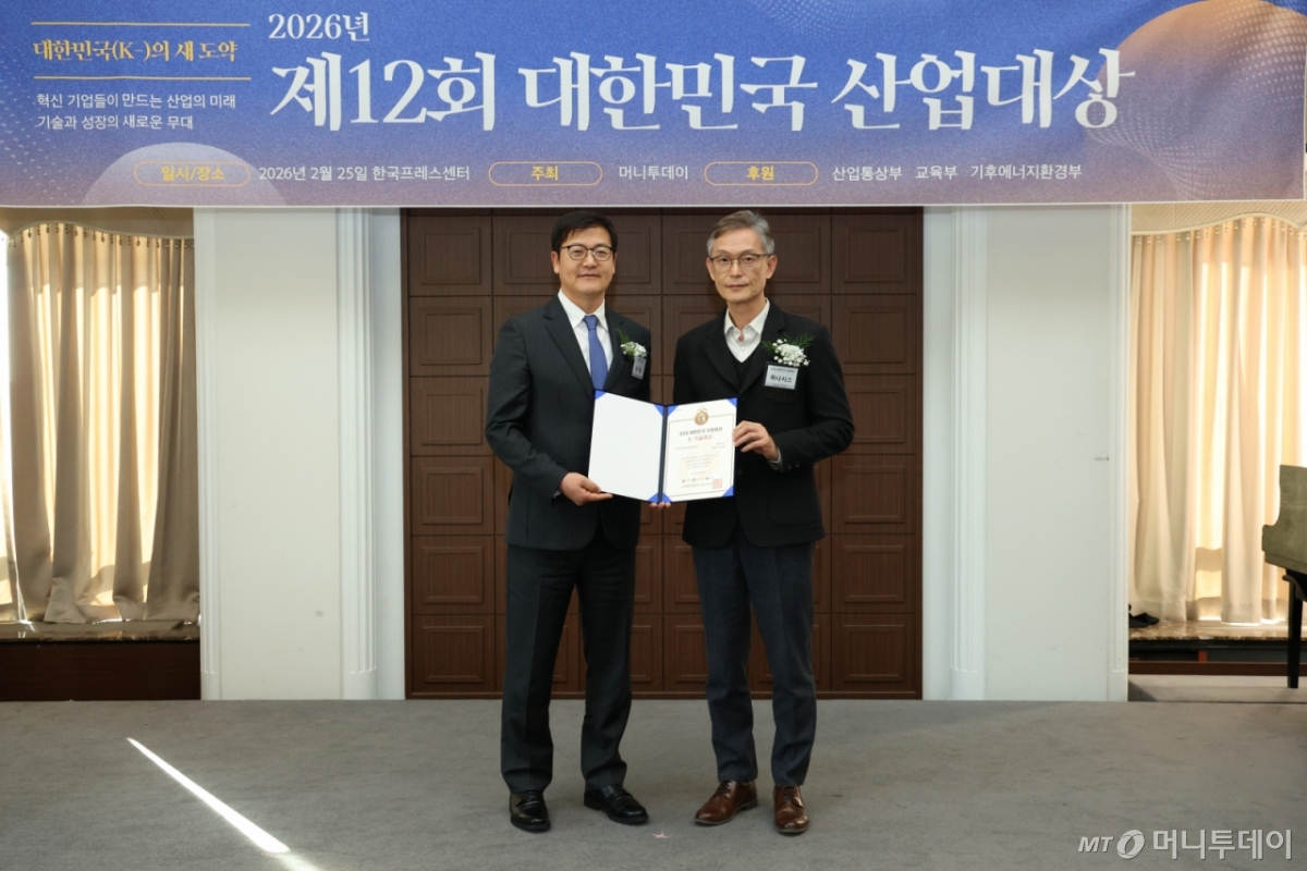 최종호 하나시스 부사장(사진 오른쪽)이 25일 오후 서울 중구 한국프레스센터에서 열린 머니투데이 주최의 '2026 제12회 대한민국 산업대상' 시상식에서 AI 무인매장 플랫폼 부문으로 'K-기술대상'을 수상한 뒤 송기용 머니투데이 전무와 기념 촬영 중이다.
