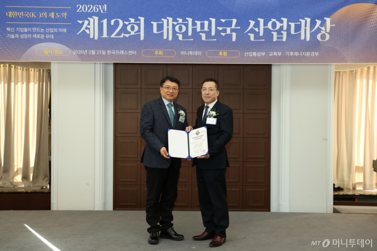 한성호 아디포랩스 대표(사진 오른쪽)가 25일 오후 서울 중구 한국프레스센터에서 열린 머니투데이 주최의 '2026 제12회 대한민국 산업대상' 시상식에서 10년 연속상으로 '온열 암치료기 수출' 부문 'K-메디컬대상'을 수상하고 이종섭 동국대학교 교수와 기념사진을 촬영 중이다.