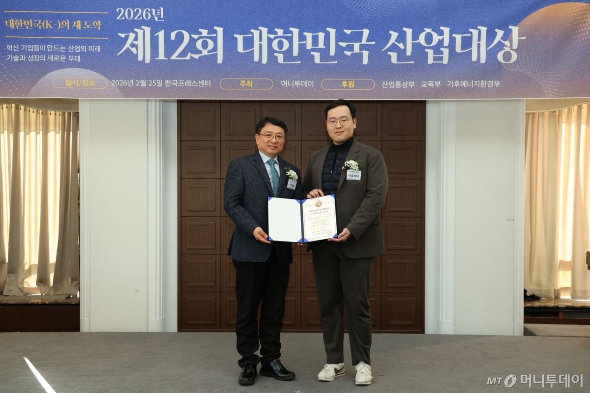 신동섭 이포에이 대표(사진 오른쪽)가 25일 오후 서울 중구 한국프레스센터에서 열린 머니투데이 주최의 '2026 제12회 대한민국 산업대상' 시상식에서 3년 연속상으로 '스포츠 뉴트리션 브랜드' 부문 'K-바이오헬스대상'을 수상하고 이종섭 동국대학교 교수와 기념사진을 촬영 중이다.