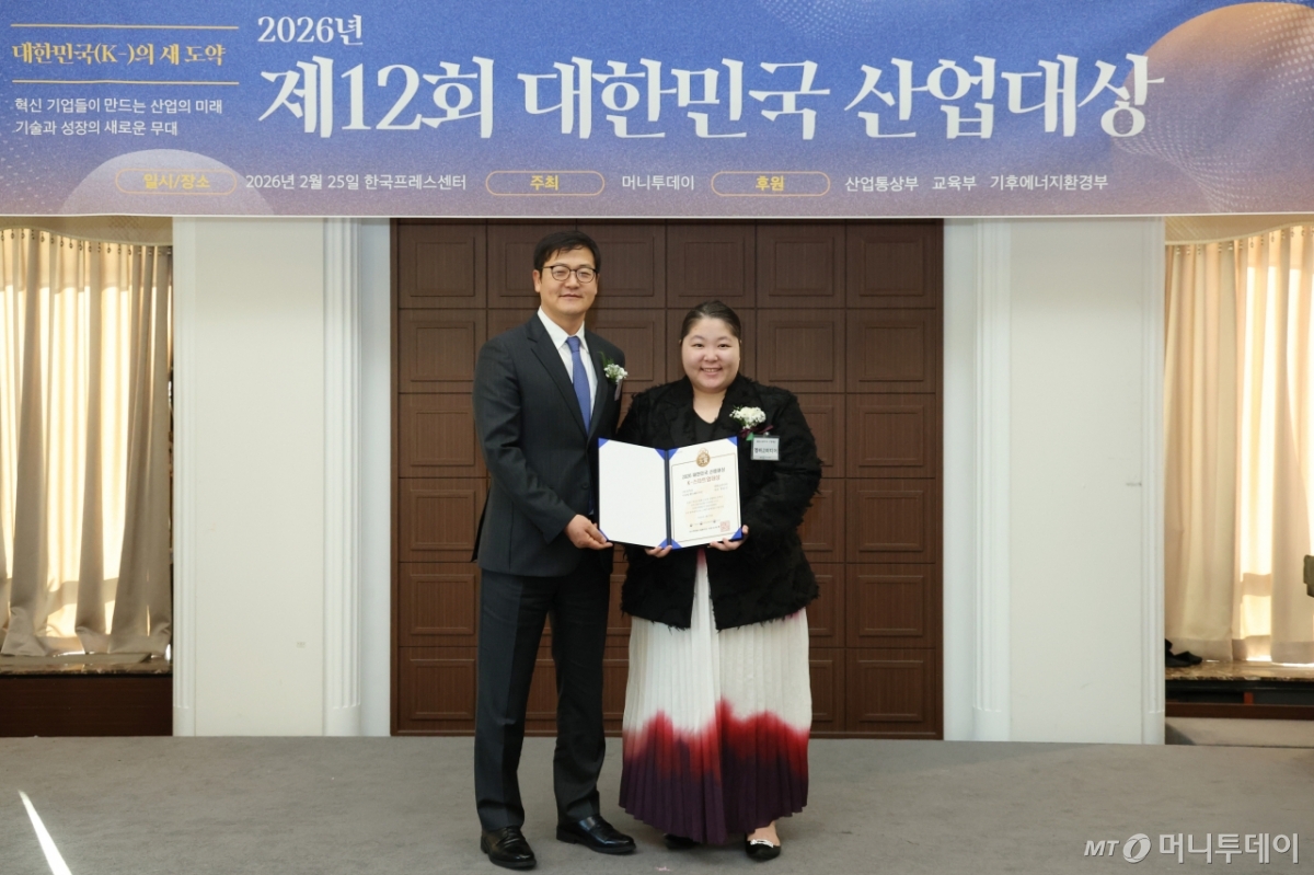 장윤진 엠바고미디어 대표(사진 오른쪽)가 25일 오후 서울 중구 한국프레스센터에서 열린 머니투데이 주최의 '2026 제12회 대한민국 산업대상' 시상식에서 2년 연속상으로 '디지털 헬스케어' 부문 'K-스타트업대상'을 수상하고 송기용 머니투데이 전무와 기념사진을 촬영 중이다.