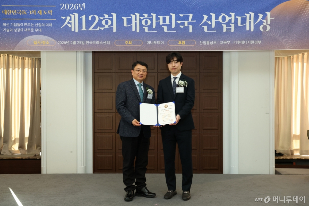 조윤호 티엠에스인더스트리 대표(사진 오른쪽)가 25일 오후 서울 중구 한국프레스센터에서 열린 머니투데이 주최의 '2026 제12회 대한민국 산업대상' 시상식에서 2년 연속상으로 '자동화 솔루션' 부문 'K-기술대상'을 수상하고 이종섭 동국대학교 교수와 기념사진을 촬영 중이다.