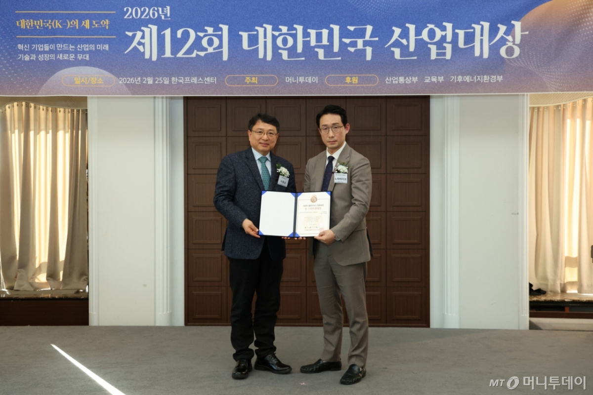 서현배 노바바이오 대표(사진 오른쪽)가 25일 오후 서울 중구 한국프레스센터에서 열린 머니투데이 주최의 '2026 제12회 대한민국 산업대상' 시상식에서 '심미적/기능적 치과솔루션 연구·개발'로 'K-스타트업대상'을 수상한 뒤 이종섭 동국대학교 교수와 기념 촬영 중이다.