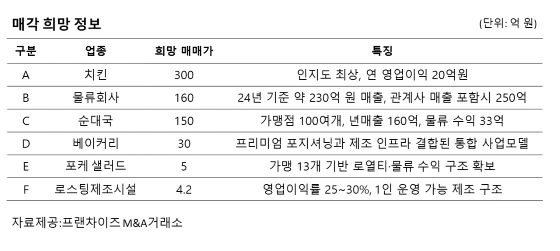 프랜차이즈 전문 자문사 프랜차이즈M&A거래소는 3월 현재 시장에서 실질 검토가 활발히 진행되고 있는 매각 희망사 6곳을 선별해 3일 공개했다.