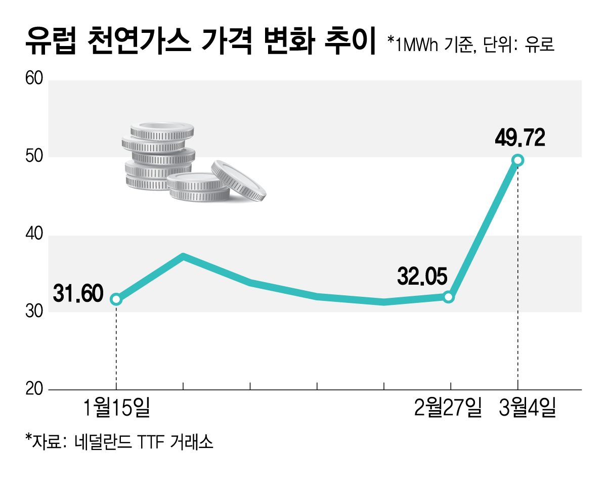 6일 외신 및 관련업계에 따르면 지난 4일(현지시간) 유럽 천연가스 가격 허브 네덜란드 TTF 거래소에서 천연가스 가격은 1㎿h(메가와트시)당 49.72유로로 지난달 27일 32.05유로 대비 약 55% 급등했다. 동북아 LNG 현물가격 지표인 JKM 지수도 전날(5일) 기준 MMBtu(백만영국열량단위)당 15.1달러로 이란 사태가 발생 직전인 10.7달러 대비 41%나 상승했다.