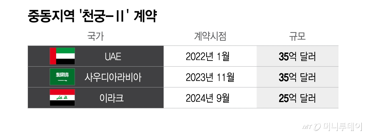 다른 중동 국가에서도 비슷한 움직임이 감지된다. 사우디아라비아와 이라크 역시 이미 체결한 천궁-Ⅱ 도입 계약과 관련해 긴급 조달 가능성을 검토하고 있는 것으로 전해졌다. 사우디아라비아는 2023년 11월 약 35억달러(약 4조3000억원) 규모 계약을 체결했고, 이라크는 2024년 9월 약 25억달러(약 3조7000억원) 규모의 계약을 맺었다. 하지만 아직 실제 납품이 이뤄지지 않은 상태다.