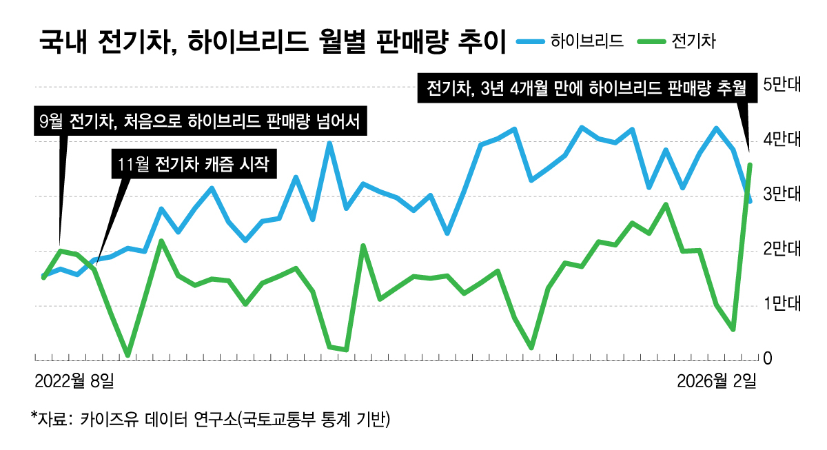 지난달 국내 전기차 판매량이 하이브리드 판매량을 넘어섰다. 연초부터 빠르게 확정된 정부 보조금과 전기차 판매 업체들의 할인 경쟁 등이 맞물린 영향이다. 최근 중동 전쟁 여파로 고유가 흐름까지 겹치면서 장기화된 전기차 캐즘(대중화 전 일시적 수요 둔화 현상)이 올해를 기점으로 끝날 수 있을지 주목된다.
