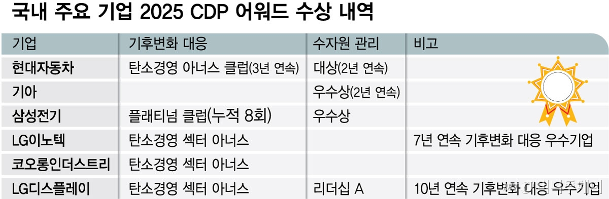 기후변화 대응 부문의 경우 리더십 A- 이상을 획득한 기업 중 상위 5개 기업에 '탄소경영 아너스 클럽'을 주고 이들을 제외한 섹터별 상위 2~4개 기업에는 '탄소경영 섹터 아너스'를 수여한다. 현대차는 리더십 A 등급을 받아 3년 연속 탄소경영 아너스 클럽에 이름을 올렸다. 삼성전기(402,000원 ▲20,000 +5.24%)의 경우 5년 연속 최상위 등급을 받아 '명예의 전당'에 오른 기업 가운데 4년 이상 지위를 유지한 기업에 부여되는 최고 등급인 '플래티넘 클럽'에 선정됐다. 아울러 LG이노텍(258,000원 ▲7,500 +2.99%)과 코오롱인더(61,800원 ▲4,300 +7.48%)스트리가 탄소경영 섹터 아너스를 받았고, LG디스플레이(11,980원 ▲650 +5.74%)는 10년 연속 리더십 A- 등급을 획득했다.