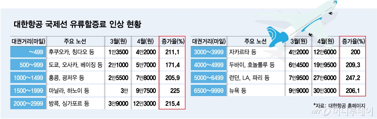 16일 항공업계에 따르면 대한항공은 다음달부터 국제선 유류할증료를 대권거리별로 대폭 인상한다. 이에 따라 최단구간인 499마일 이하 노선은 이달 편도 기준 1만3500원에서 다음달 4만2000원으로, 최장구간인 6500마일 이상 노선은 9만9000원에서 30만3000원으로 각각 오른다.