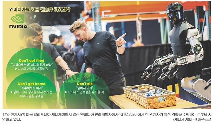 세계 최대 인공지능(AI) 제국을 건설 중인 젠슨 황 엔비디아 최고경영자(CEO)가 제시한 경영 철학은 예상보다 훨씬 처절하고 실존적이었다. 17일(현지시간) 미국 캘리포니아 새너제이에서 열린 'GTC 2026' 기자간담회에서 황 CEO는 엔비디아를 지탱하는 3가지 핵심 축을 공개하며 "이것이 나의 가장 어려운 업무"라고 고백했다.