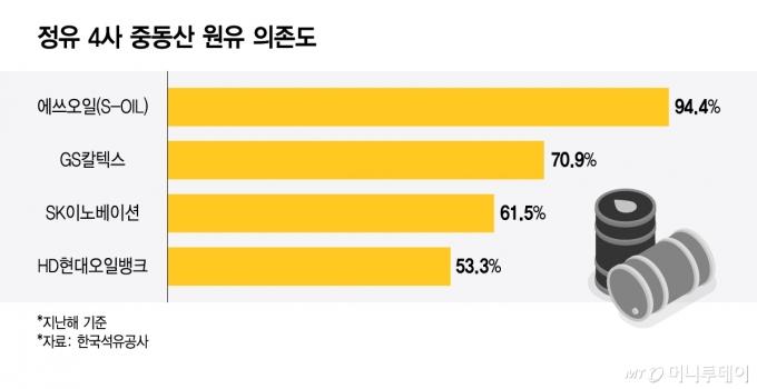 에쓰오일(S-OIL)은 대주주인 사우디아라비아 아람코가 서부 홍해 연안 얀부 항을 활용해 수출에 나서면서 일부 수급 불안이 완화됐다. 얀부 항의 실질 선적 능력은 하루 약 400만 배럴로 기존 호르무즈 해협 수출량(하루 550만 배럴)의 70% 수준이다. 다만 나머지 정유사들의 상황은 녹록지 않다. 한국석유공사에 따르면 이들 3사의 지난해 기준 중동 외 원유 비중은 GS칼텍스 29.1%, SK이노베이션 38.5%, HD현대오일뱅크 46.7% 등이다. 업계 관계자는 "국제 유가가 급등한 데다 해상 운임도 크게 오른 상황"이라며 "고가에 중동 밖 원유를 들여왔다가 도착하기도 전에 호르무즈 봉쇄가 해제되면 비싼 값에 사서 낮은 가격에 파는 역마진 위험이 발생한다"고 지적했다. 또다른 관계자도 "가격 상한제 도입 이후 정유사 손실을 보전할 제도적 장치가 마련되지 않은 상황에서 고가 원유 도입을 확대하기는 쉽지 않다"고 했다.