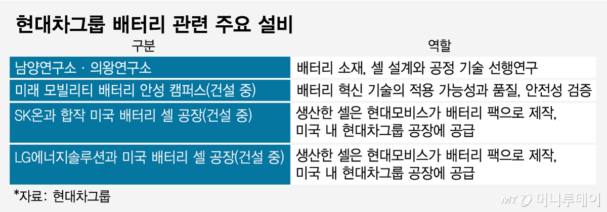 한편 현대차·기아는 남양연구소와 의왕연구소 등에서 배터리 소재, 셀 설계와 공정기술 선행연구를 수행한다. 지난해 말에는 경기 안성시에 '미래 모빌리티 배터리 안성캠퍼스'를 구축하기 시작했다. 총 1조2000억원을 투입해 올해말 준공하는 이 캠퍼스에 셀 제조 전공정을 수행할 수 있는 첨단설비를 갖추고 배터리 혁신기술의 적용 가능성과 품질, 안전성을 검증할 계획이다.