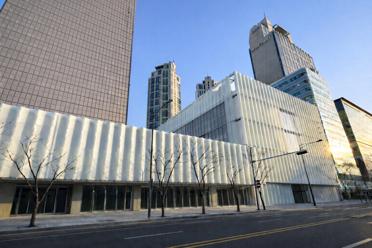 '퐁피두센터 한화' 건물은 과거 아쿠아리움이 있던 63빌딩 별관을 전면 리모델링해 마련했다. 각 약 1653㎡(500평) 규모의 메인 전시실 2개를 갖춘 미술관으로 새롭게 재탄생했다. 외관은 63빌딩의 수직성과 대비되는 수평적 '빛의 띠' 형태와, 전통 기와의 곡선을 연상시키는 반투명 이중유리 외피가 특징이다. 설계는 루브르박물관 리노베이션, 엘리제궁, 인천국제공항 프로젝트 등을 맡았던 프랑스 건축의 거장 장-미셸 빌모트가 담당했다.