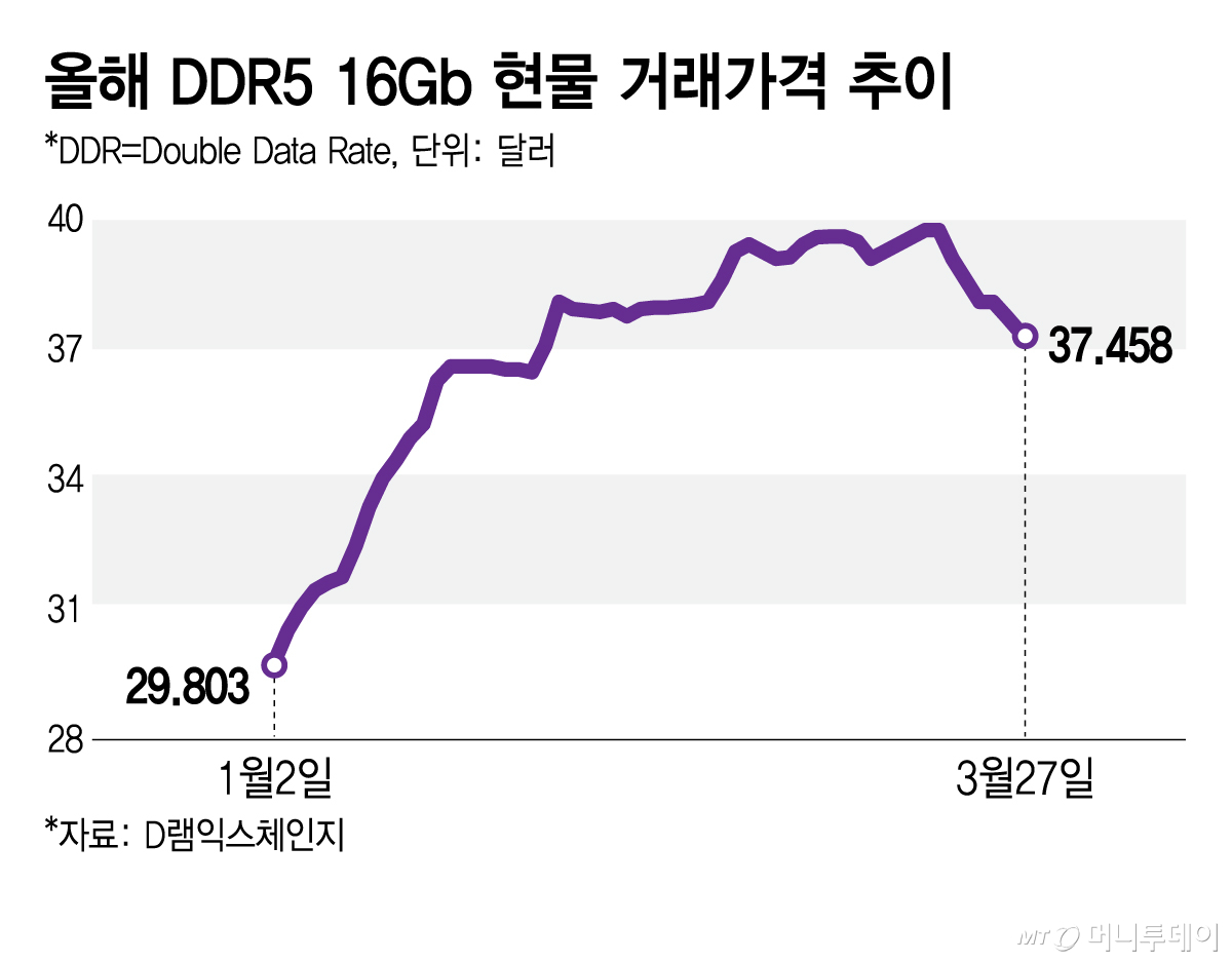 31일 시장조사업체 D램익스체인지에 따르면 지난 27일 PC용 DDR5(더블데이터레이트5) 16GB(기가바이트) 현물가격은 37.5달러로 한 달 전보다 5.2% 떨어졌다. DDR5 현물가격은 지난 18일 39.8달러까지 오른 이후 하락세로 전환됐다. 전월 말 대비 현물가격이 5% 이상 하락한 것은 최근 6개월 사이 처음이다.