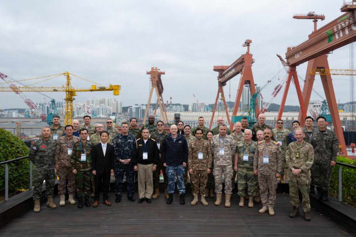 HD현대중공업(443,000원 ▼22,000 -4.73%)은 지난달 31일 주한 외국 무관단 25개국 30명이 울산 본사를 방문해 조선소와 함정 건조 현장을 둘러보고 첨단 함정 기술에 대한 브리핑을 받았다고 1일 밝혔다.