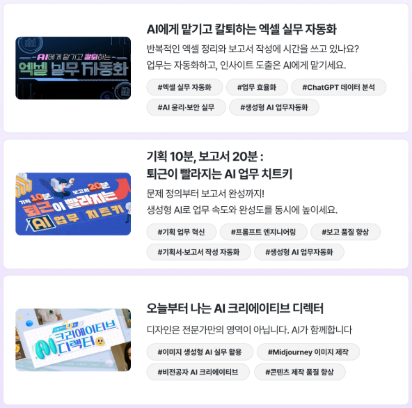 덧붙여 업무에 밀접한 실무 중심의 중급/응용 'AI 융합 훈련' 과정으로 ▲'유통 마케팅 AI 자동화 루틴', ▲'제조업 스마트워크 전환 : 생성형 AI 기반 업무 효율화 실무'를 운영 중이다.