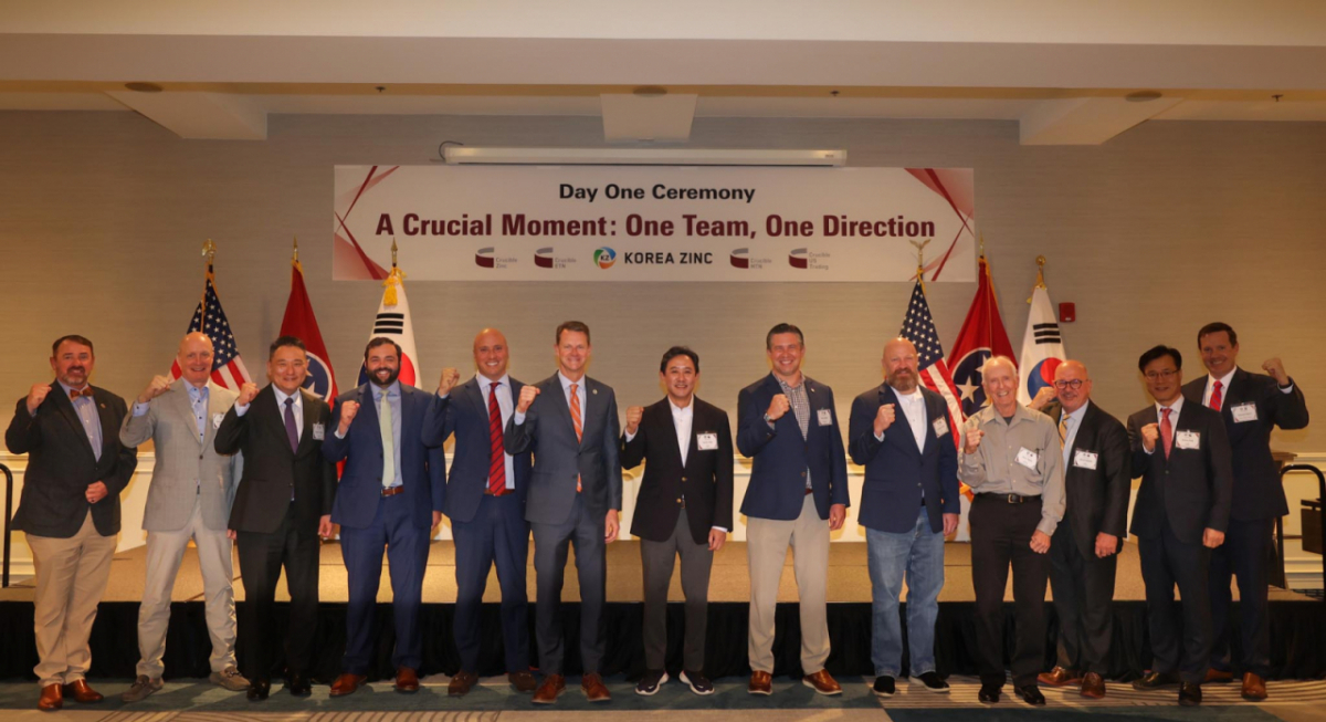 고려아연이 1일(현지시간) 미국 테네시주 클라크스빌에서 현지 통합 제련소 건설사업인 '프로젝트 크루서블'의 공식 기념식을 개최했다고 2일 밝혔다. 이날 기념식에선 '크루서블징크'와 계열사들의 공식 출범을 알렸다. 최윤범 고려아연 회장을 포함한 주요 경영진과 현지 임직원이 참석했다. 스튜어트 맥워터 테네시주 부지사, 웨스 골든 몽고메리카운티 시장 등 현지 인사들도 함께했다.