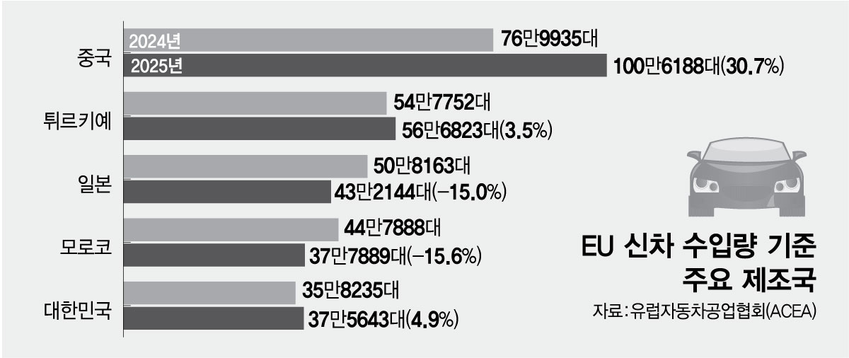 6일 유럽자동차공업협회(ACEA)가 발간한 '2025년 연간 경제·시장 보고서'에 따르면 유럽연합(EU) 내 판매된 차량 중 중국에서 생산된 차량의 비중은 2024년 5%에서 지난해 7%로 상승했다. 같은 기간 중국산 차량의 EU 수입물량은 30.7% 증가한 100만6188대로 사상 처음으로 100만대 고지를 넘어섰다. 수입액 기준으로도 중국은 137억2400만유로(약 23조8000억원)를 기록하며 EU의 최대 자동차 수입국 지위를 확고히 했다.