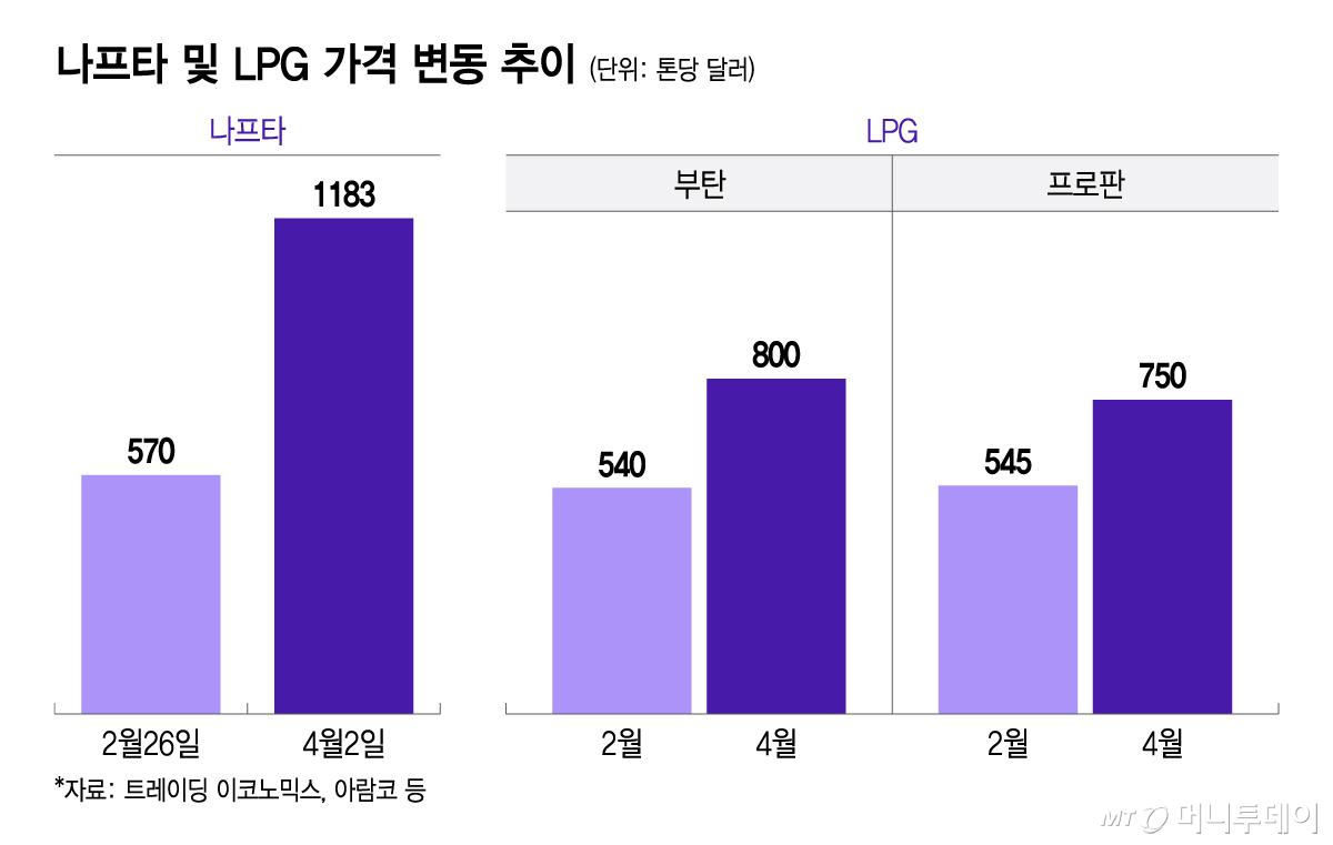 LPG의 경우 북미 수입비중이 절대적으로 높은 데다 전쟁 발발 후에는 나프타 대비 가격적 이점 역시 더욱 커졌다. LPG를 최대한 활용해 에틸렌·프로필렌 생산량만 유지할 수 있어도 석유화학업계 입장에서는 일종의 시간 벌기가 가능하다. 다만 에틸렌·프로필렌 외에 부타디엔·벤젠·자일렌 등 다양한 기초유분까지 만들기 위해서는 나프타가 반드시 필요하다.