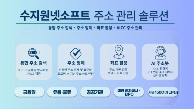 수지원넷소프트의 주요 솔루션은 △통합 주소검색 솔루션(상세주소 표시 및 유사어·축약어 검색) △주소 정제 솔루션(건당 0.7밀리초 처리) △정제 주소 기반 주소 좌표·키값 등 매핑용 주소 코드 데이터 제공 및 고객관계관리(CRM) 활용 지원 △음성인식(STT) 기반 AI주소봇 △유지보수 시스템(일고시·월고시 반영) 등이다.