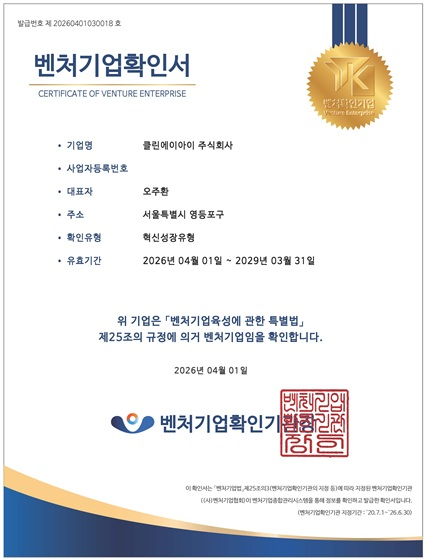 AI(인공지능) 기반 건물위생관리 스타트업 클린에이아이(대표 오주환)가 혁신성장유형 벤처기업 인증을 획득했다고 8일 밝혔다.