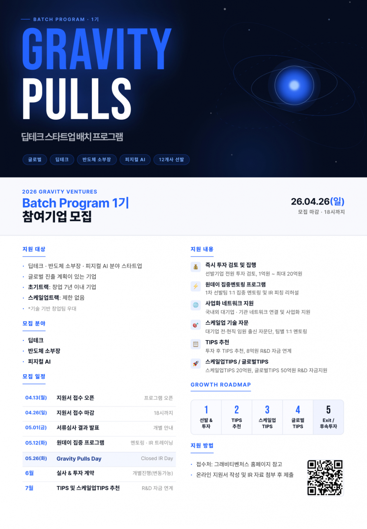 그래비티벤처스(각자대표 정주용·김샛별)는 딥테크, 반도체 소부장, Physical AI 분야 혁신 기술 스타트업을 발굴·육성하기 위한 배치 프로그램 'Gravity Pulls(그래비티 풀스)' 1기 모집을 시작한다고 13일 밝혔다.