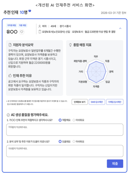 AI 모델은 직무, 직종, 경력, 임금, 자격, 지원 유형, 거리, 경력 일관성 등 8개 항목을 종합 분석한다. 분석 결과는 '종합 매칭지표'로 시각화되며, 추천 이유를 요약 제공해 채용 담당자가 빠르게 적합성을 판단할 수 있도록 지원한다.