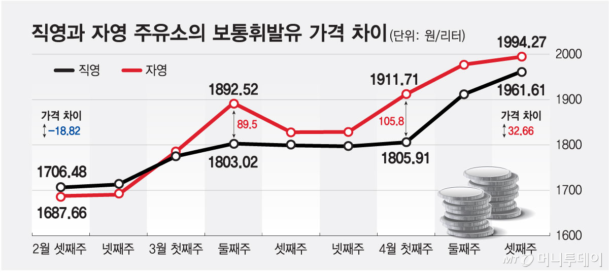 단통법처럼 최고가격제 역시 시행 직후부터 혼선이 나타났다. 자영 주유소 가격이 직영보다 더 가파르게 오르는 현상이 나타난게 대표적이다. 정유사가 직접 운영하는 직영 주유소는 인건비·운영비 등 고정비가 반영돼 가격이 상대적으로 높게 형성되는 반면 자영 주유소는 대리점을 통한 대량 공급과 가격 경쟁을 기반으로 더 저렴하게 판매되는 구조다. 그런데 직영이나 자영이나 동일한 최고가격제를 적용받는 상황 속에서 고가 재고를 보유한 자영 주유소들이 가격 경쟁력을 상실하는 현상이 지속되고 있다.