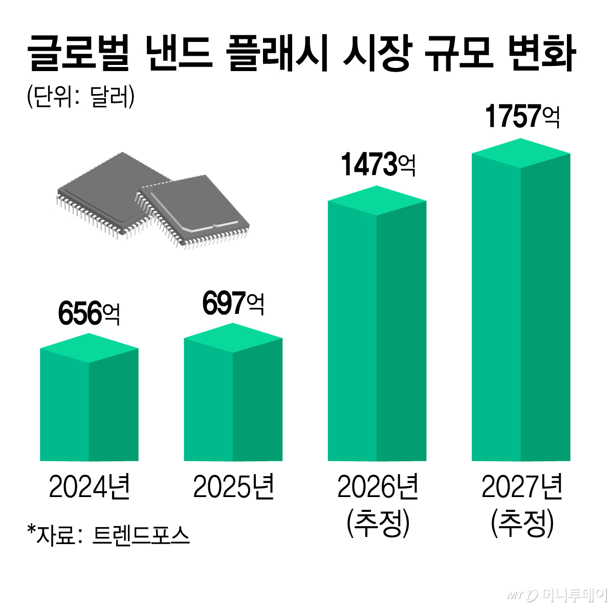 13일 시장조사업체 트렌드포스에 따르면 올해 글로벌 낸드 시장규모는 1473억달러(약 220조원)로 추정된다. 지난해 대비 약 2배 성장한 수준이다. 내년에는 올해보다 19% 증가한 1757억달러(약 262조원)에 이를 것으로 전망된다.