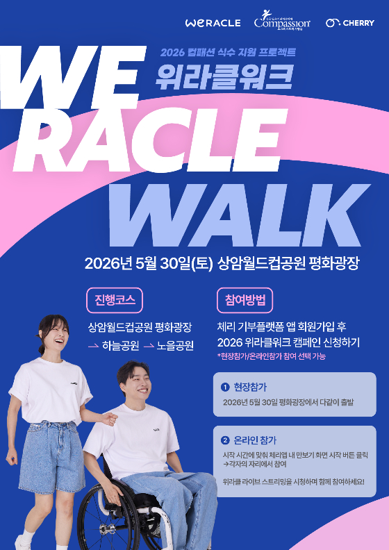 블록체인 기반 기부 플랫폼 '체리'(CHERRY)가 유튜버 위라클과 함께 오는 5월30일 서울 상암 평화의공원 평화광장에서 걷기 나눔 행사 '2026 위라클워크'를 연다고 14일 밝혔다. 이 행사는 위라클, 체리, 한국컴패션이 공동 주최한다.