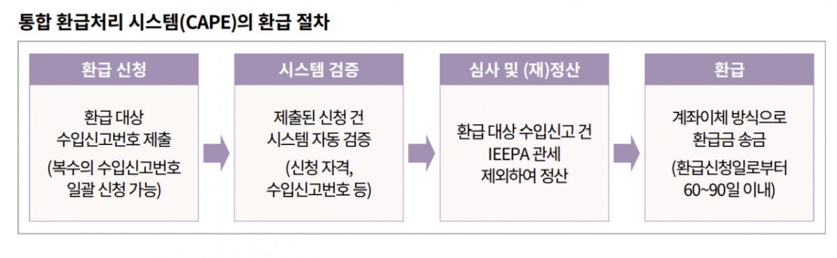 무협은 "모든 환급 절차는 (CAPE를 통한) 전자적 방식으로 진행될 예정"이라며 "처리 방식은 간소화되었으나, 자동 환급이 아니라 기업의 개별 신청이 필요함에 유의해야 한다"고 설명했다. 이어 "자동상업환경(ACE) 계정과 미국 내 계좌 정보가 없는 경우 환급 수령이 불가하다"며 "ACE 포털상 계정과 미국 내 금융계좌를 사전에 확보해야 하며, 미국 계좌가 없을 경우 제3자 지정도 가능하다"고 강조했다.