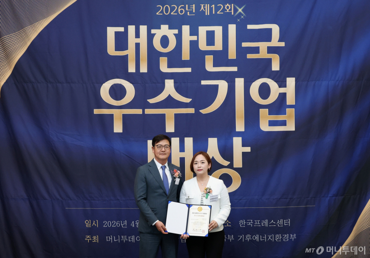 박시은 AI에듀브릿지 대표(사진 오른쪽)가 16일 오후 서울 중구 한국프레스센터에서 열린 머니투데이 주최의 '2026 제12회 대한민국 우수기업대상' 시상식에서 '실무 중심 AI 교육' 부문 '우수스타트업대상'을 수상하고 송기용 머니투데이 전무와 기념사진을 촬영 중이다.