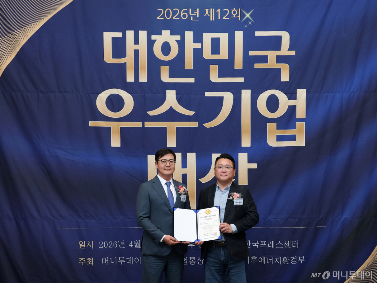 정철호 에코센싱 대표(사진 오른쪽)가 16일 오후 서울 중구 한국프레스센터에서 열린 머니투데이 주최의 '2026 제12회 대한민국 우수기업대상' 시상식에서 '위성 영상처리 응용소프트웨어 개발' 부문 '우수R&D대상'을 수상하고 송기용 머니투데이 전무와 기념사진을 촬영 중이다.
