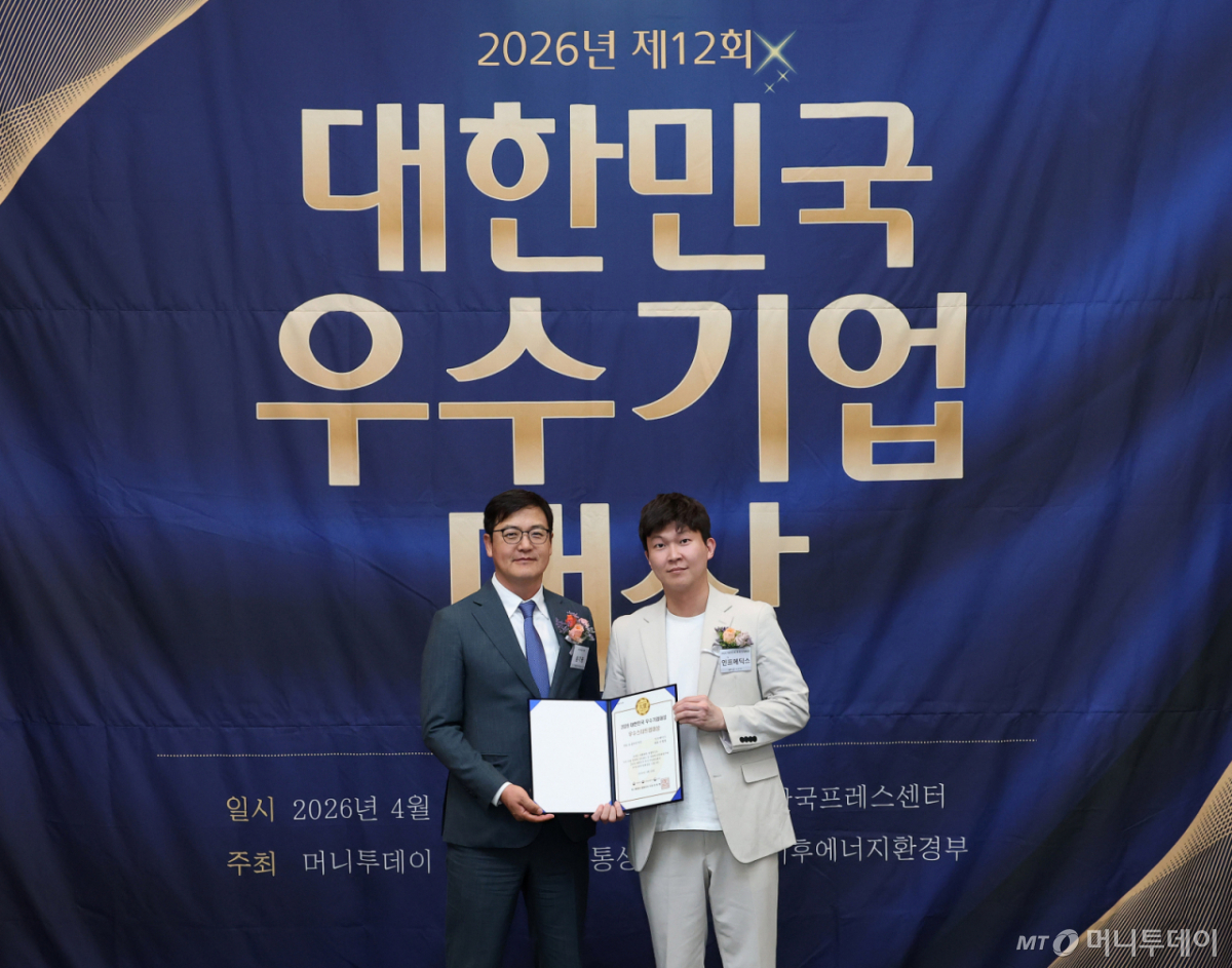 김태훈 인프메딕스 CTO(사진 오른쪽)가 16일 오후 서울 중구 한국프레스센터에서 열린 머니투데이 주최의 '2026 제12회 대한민국 우수기업대상' 시상식에서 '의료 AI 솔루션' 부문 '우수스타트업대상'을 수상하고 송기용 머니투데이 전무와 기념사진을 촬영 중이다.