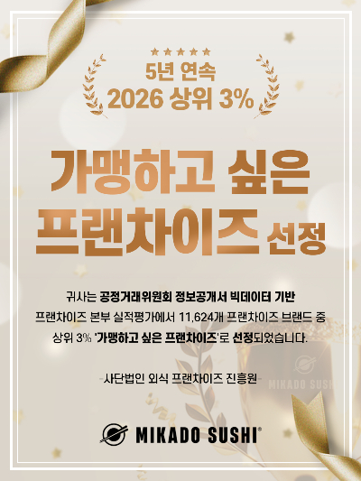 회전초밥 프랜차이즈 미카도스시가 '2026 상위 3% 가맹하고 싶은 프랜차이즈 300'에 5년 연속 선정되며 경쟁력과 브랜드 신뢰도를 다시 한번 입증했다.