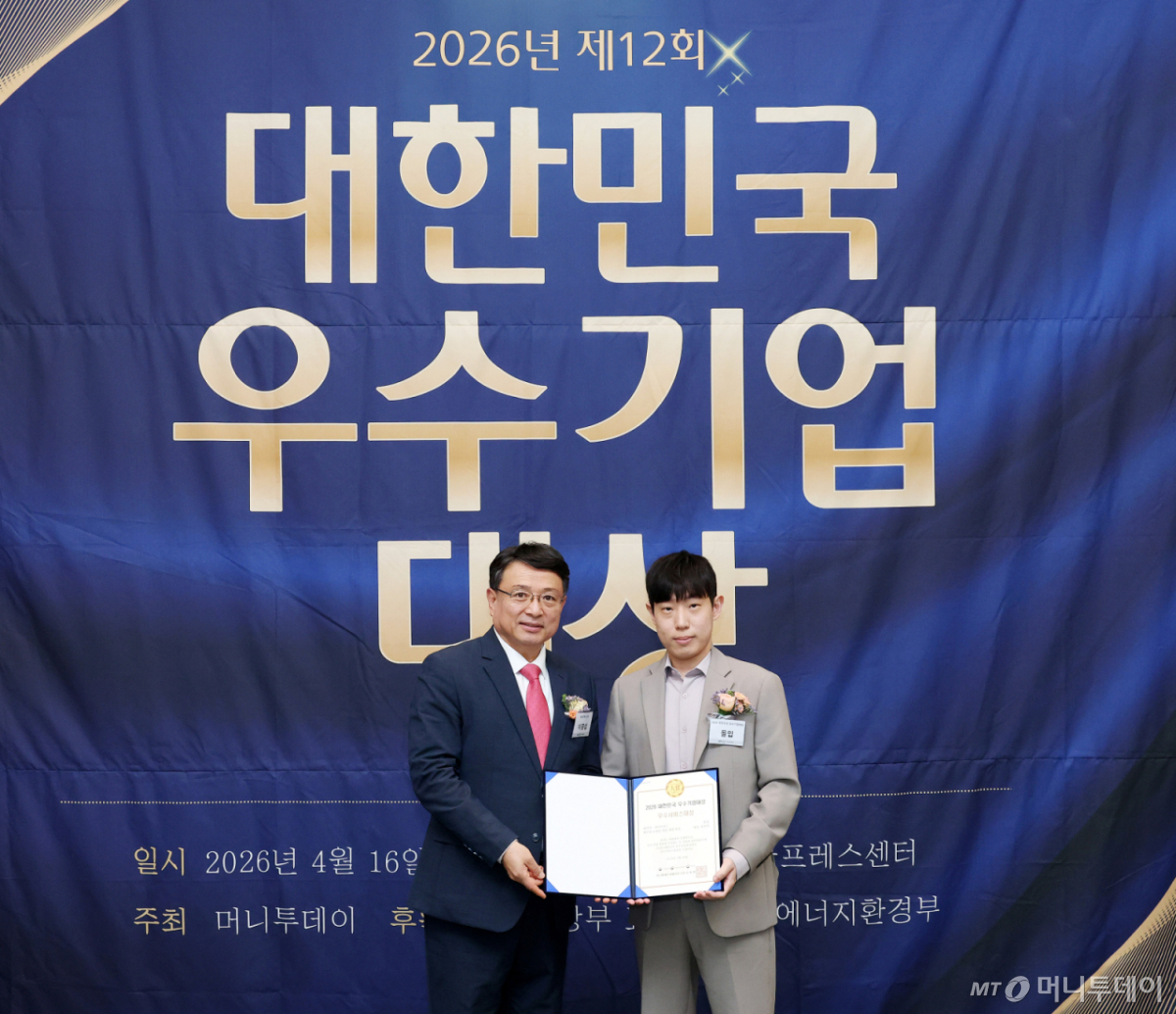정현락 몰입 대표(사진 오른쪽)가 16일 오후 서울 중구 한국프레스센터에서 열린 머니투데이 주최의 '2026 제12회 대한민국 우수기업대상' 시상식에서 '하이퍼·하이브리드 캐주얼 모바일 게임 개발' 부문 '우수서비스대상'을 받고 이종섭 동국대학교 교수와 기념사진을 찍고 있다.