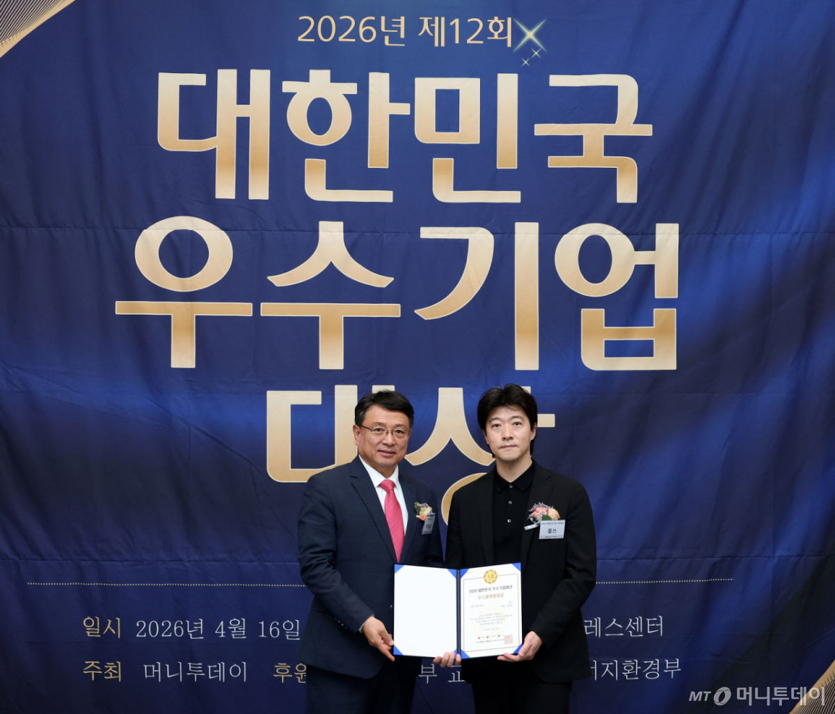 김태호 줍쓰 대표(사진 오른쪽)가 16일 오후 서울 중구 한국프레스센터에서 열린 머니투데이 주최의 '2026 제12회 대한민국 우수기업대상' 시상식에서 '자원순환' 부문 '우수플랫폼대상'을 받고 이종섭 동국대학교 교수와 기념사진을 찍고 있다.
