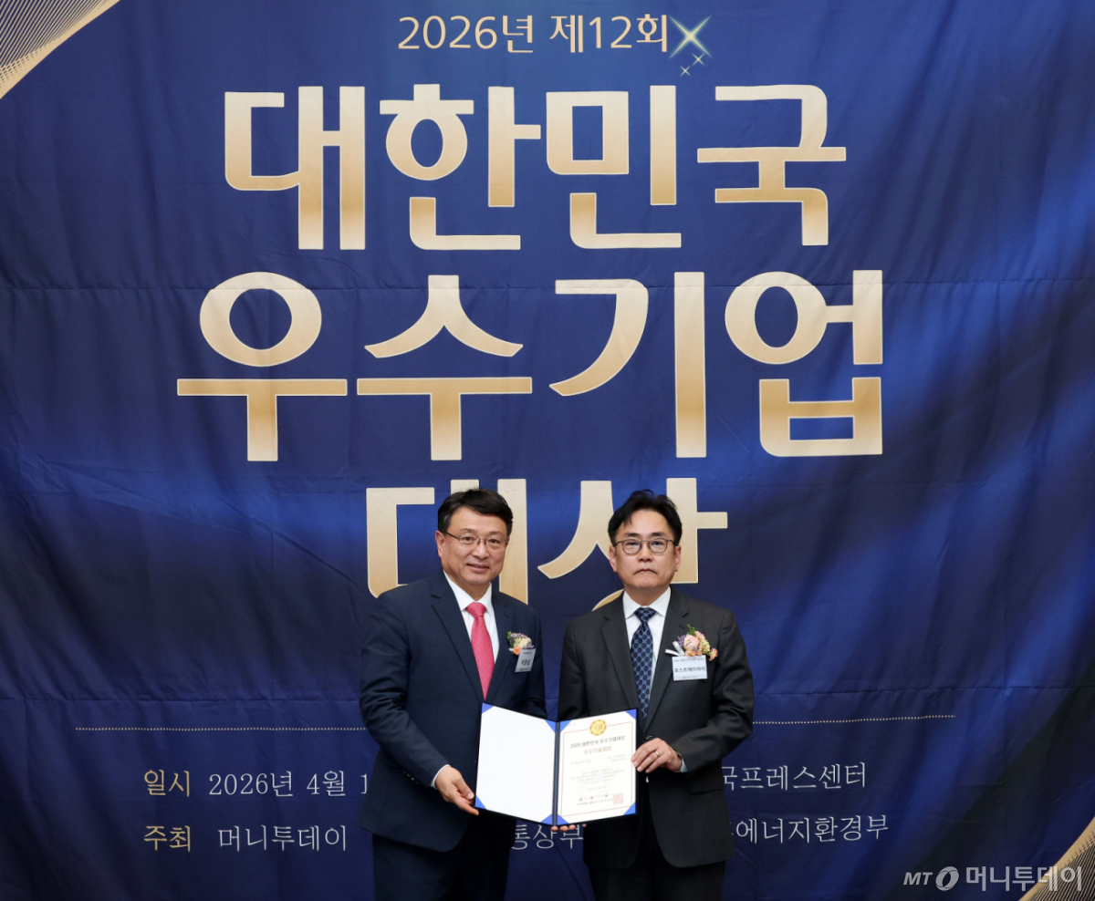 조인호 포스트에이아이 대표(사진 오른쪽)가 16일 오후 서울 중구 한국프레스센터에서 열린 머니투데이 주최의 '2026 제12회 대한민국 우수기업대상' 시상식에서 'AI 에이전트' 부문 '우수기술대상'을 받고 이종섭 동국대학교 교수와 기념사진을 찍고 있다.