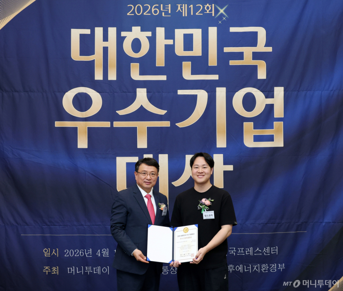김진한 맘스코치 대표(사진 오른쪽)가 16일 오후 서울 중구 한국프레스센터에서 열린 머니투데이 주최의 '2026 제12회 대한민국 우수기업대상' 시상식에서 '개인화 학습 관리 플랫폼' 부문 '우수스타트업대상'을 받고 이종섭 동국대학교 교수와 기념사진을 찍고 있다.