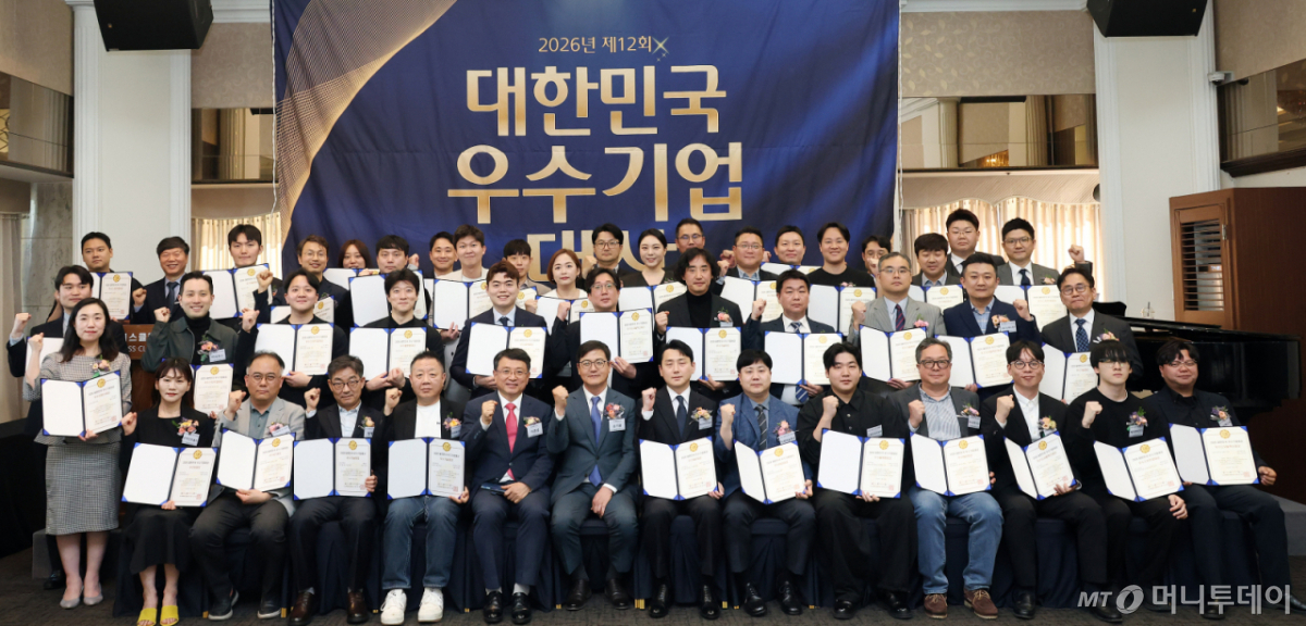 16일 서울 중구 프레스센터에서 열린 머니투데이 주최 '제12회 대한민국 우수기업 대상' 시상식. /사진=김창현 기자 chmt@ 16일 오후 서울 중구 한국프레스센터에서 열린 머니투데이 주최의 '2026 제12회 대한민국 우수기업대상' 시상식에서 수상자들이 단체 기념 촬영을 하고 있다. 독자들의 PICK! 100만원도 못 벌던 개그맨..."수입 1000배" 변호사 된 깜짝 근황 "조진웅, 은퇴할 줄 몰랐다…식사 제안도 거절" 정지영 감독이 전한 근황 치어리더 정가예 "폭언·욕설에 병원 치료→활동 중단" 무슨 일? "새벽에 전화, 돈 요구" 김원희, 사생활 털렸다...해킹범이 협박