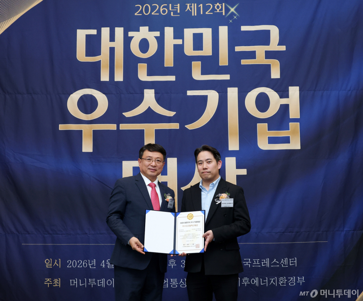 정원석 아이넥스코퍼레이션 이사(사진 오른쪽)가 16일 오후 서울 중구 한국프레스센터에서 열린 머니투데이 주최의 '2026 제12회 대한민국 우수기업대상' 시상식에서 '4년 연속상'으로 'AI 내시경 소프트웨어' 부문 '우수디지털혁신대상'을 받고 이종섭 동국대학교 교수와 기념사진을 찍고 있다.