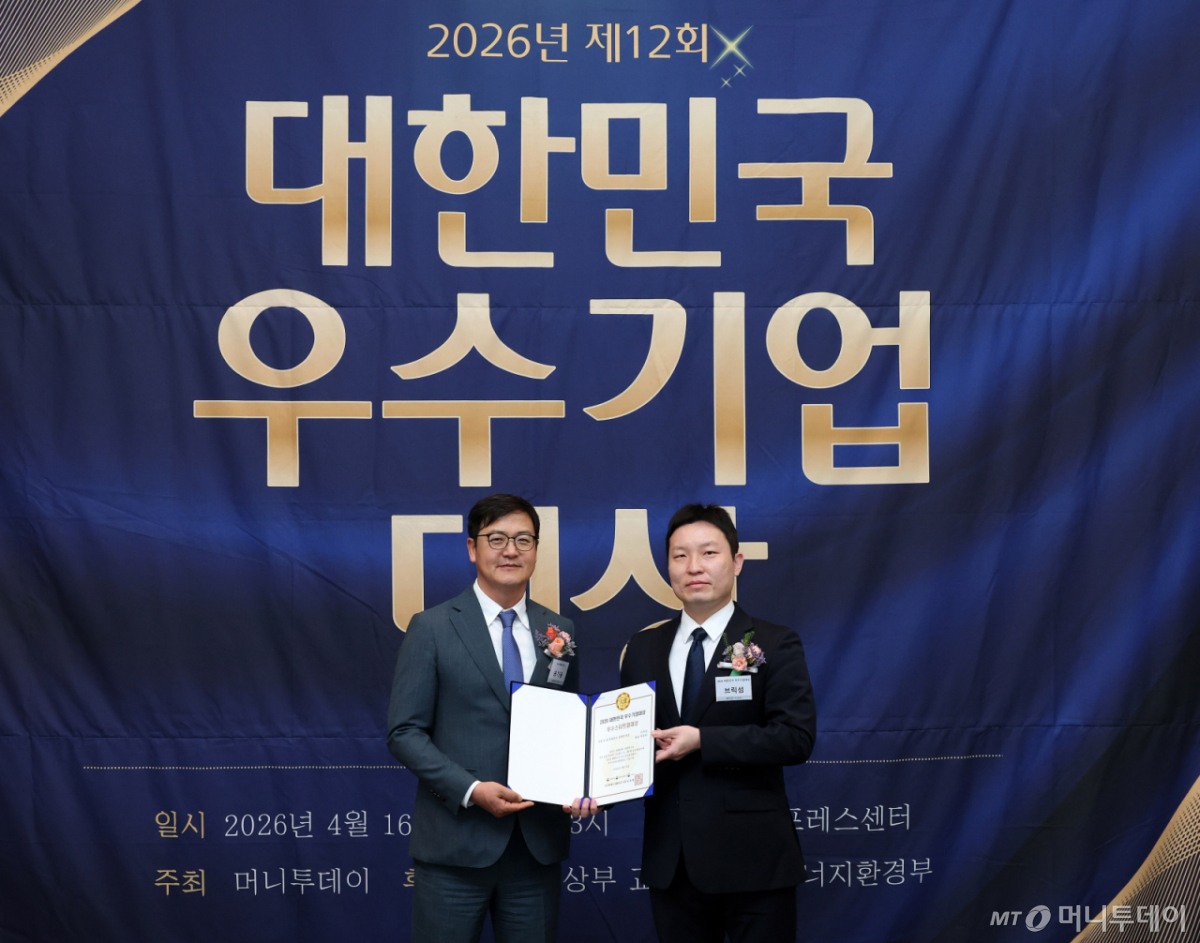 박종찬 브릭섬 대표(사진 오른쪽)가 16일 오후 서울 중구 한국프레스센터에서 열린 머니투데이 주최의 '2026 제12회 대한민국 우수기업대상' 시상식에서 '이종 AI 칩 통합관리 플랫폼' 부문 '우수스타트업대상'을 수상하고 송기용 머니투데이 전무와 기념사진을 촬영 중이다.